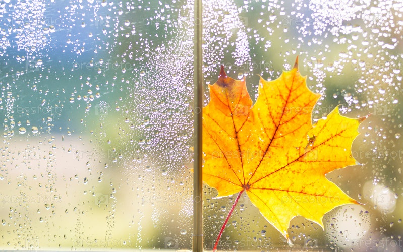 Желтый сухой кленовый лист с каплями дождя прилип к мокрому стеклу окна. Осеннее настроение, прогноз погоды