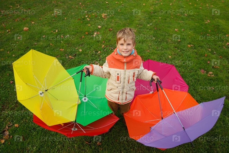 Мальчик с разноцветными зонтами в осеннем парке