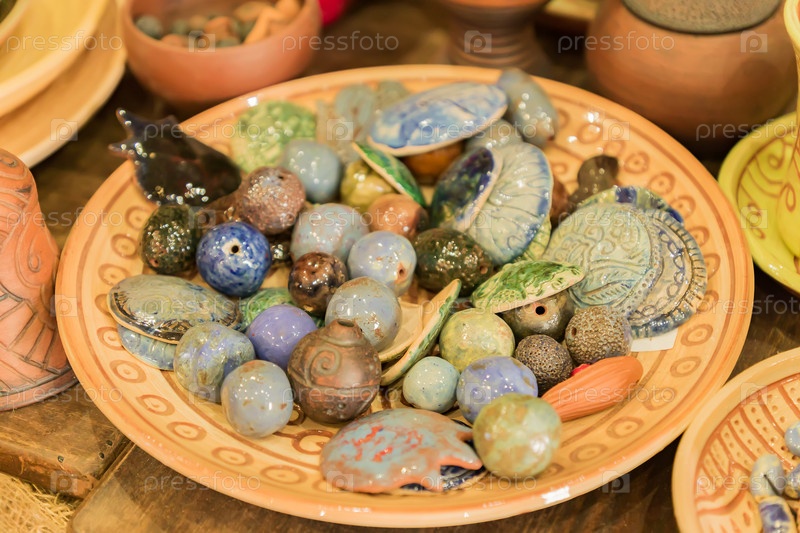Разные глиняные бусины в гончарной мастерской, крупным планом
