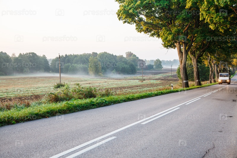 Большой грузовик на новой асфальтированной дороге в лесу