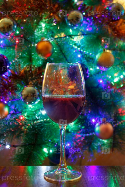 Бокал красного вина, стоящий на столе с ярким фоном елки с цветными огнями