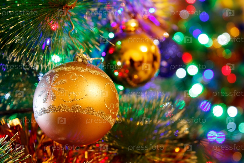 Яркие разноцветные декоративные шары на елке крупным планом в помещении