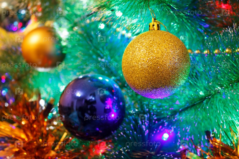 Яркие разноцветные декоративные шары на елке крупным планом в помещении