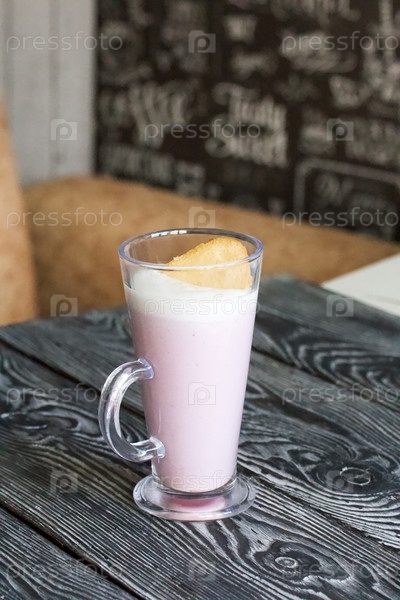 Малиновое суфле в стеклянном бокале. стоит на столе из сосновых досок. Крупный план