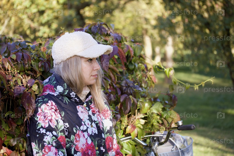 Девушка в осенней одежде стоит возле живой изгороди. Рядом есть велосипед. Осенний городской парк