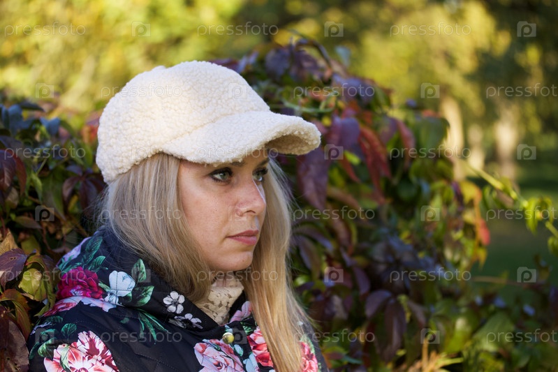 Портрет девушки в осенней одежде возле живой изгороди. Осенний городской парк