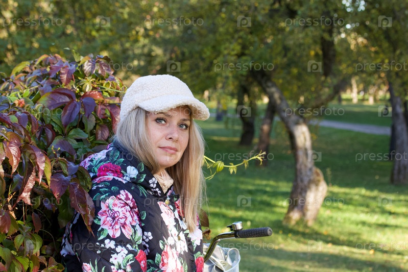 Девушка на прогулке в осеннем парке. Одет в осеннюю одежду. Рядом есть велосипед. Осенний городской парк