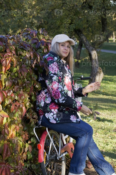 Девушка на прогулке в осеннем парке. Одет в осеннюю одежду. Рядом есть велосипед. Осенний городской парк