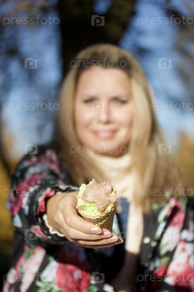 Девушка держит мороженое в протянутой руке. Одет в осеннюю одежду. Осенний городской парк