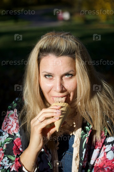 Девушка сидит на скамейке в осеннем парке. Ест мороженое. Одет в осеннюю одежду. Осенний городской парк