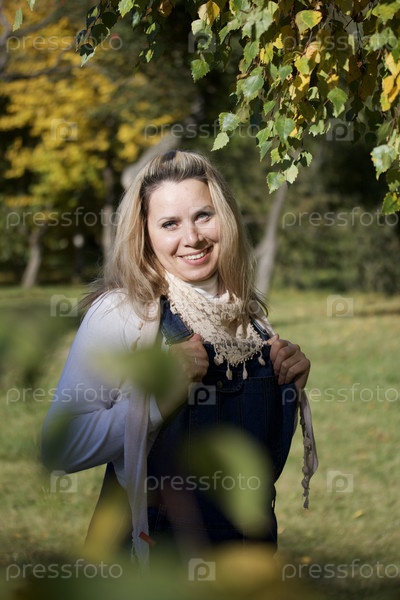 Девушка стоит в осеннем парке и улыбается. Одет в осеннюю одежду. Осенний городской парк