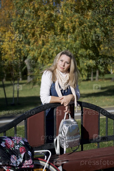 Девушка стоит возле скамейки в осеннем парке и улыбается. Одет в осеннюю одежду. Осенний городской парк