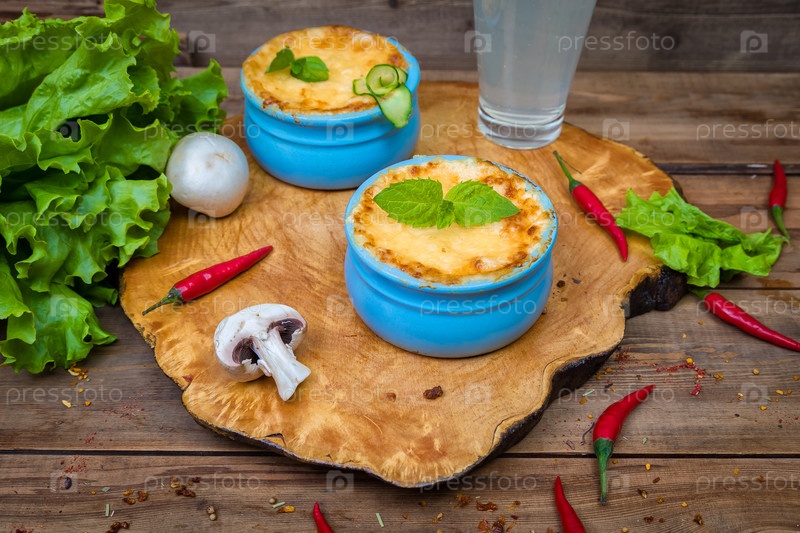 Горшки с жульеном из грибов на деревянной доске
