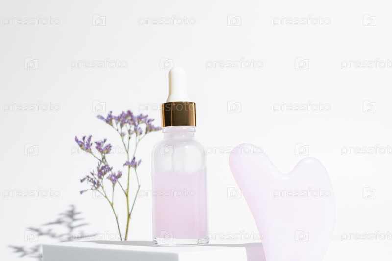 Розовые инструменты для массажа лица Gua Sha. Нефритовый скребок из розового кварца и косметическое масло для лица на белом фоне. Антивозрастный, лифтинговый и тонизирующий уход в домашних условиях