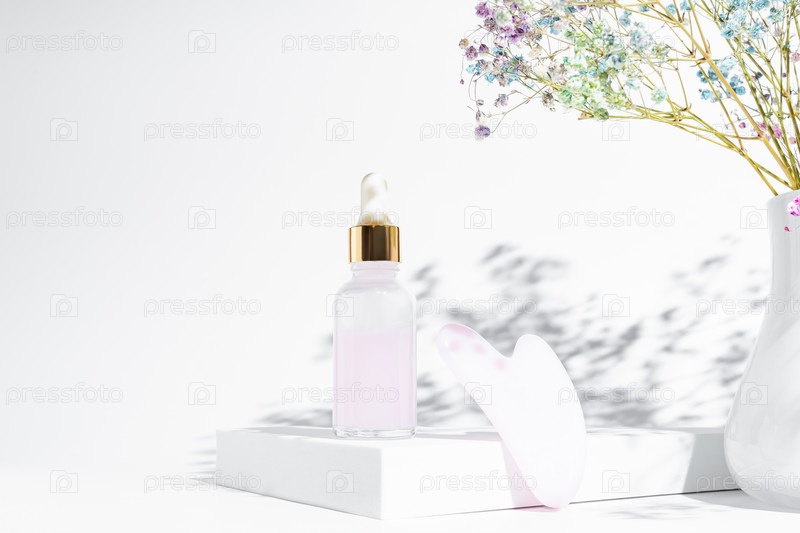 Натуральное эфирное масло, сыворотка в стеклянной бутылке на белом фоне. Альтернативная медицина, ароматический травяной косметический продукт по уходу за кожей. Минимальный стиль, пространство для копирования, макет