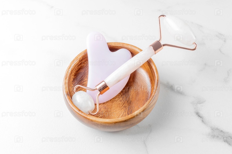 Инструмент для массажа Pink Guasha и скребок в деревянной миске на мраморном фоне. Нефритовый ролик из розового кварца. Уход за кожей в домашних условиях, омоложивающая и лифтинговая терапия. образ жизни