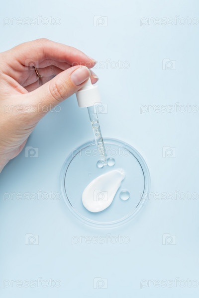 Женская рука держит пипетку с сывороткой для лица или пилинг над чашкой Петри с образцами сливок и масла. Органическая косметика. Плоская планировка сверху, пространство для копирования. Косметика, СПА брендинг, макет