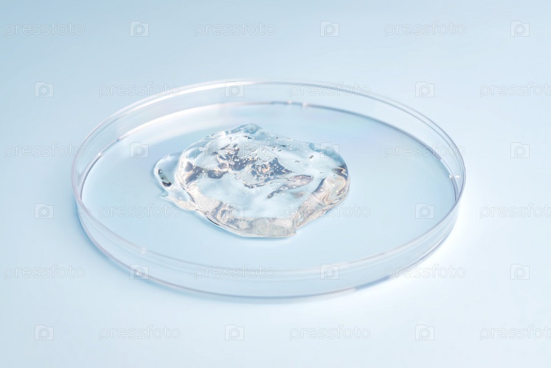 Чашка Петри с гелем или косметической жидкостью на синем фоне. Прозрачный контейнер с гелем с пузырьками. Текстура геля. Концепция медицины и красоты. Медицинская посуда для лабораторий