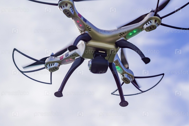 Летающий беспилотник с дистанционным управлением на фоне голубого неба