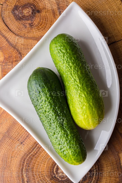 Два свежих зеленых огурца на белом блюдце. Концепция здорового питания. Вид сверху
