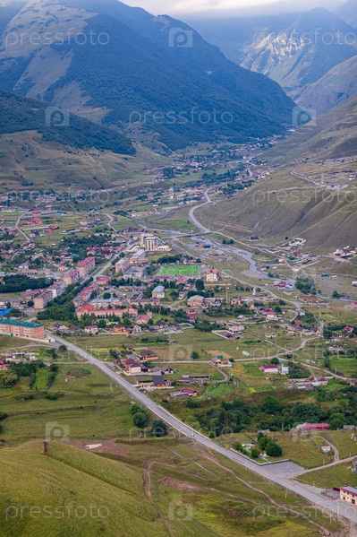 Горный пейзаж с городом на дне ущелья. Верхний Фиагдон в Северной Осетии