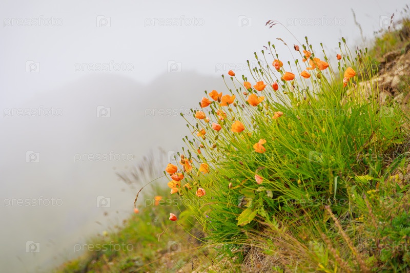 Оранжевые цветы дикого мака растут в горах. Туман