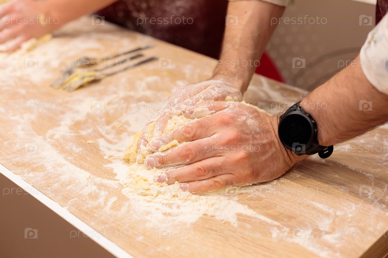 Руки нескольких человек месят тесто на столе. Смешайте сырое яйцо с мукой