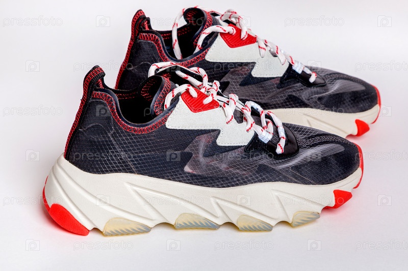 Женские, модные, спортивные кроссовки, черные с красными вставками на белом фоне. Новые молодежные туфли для девочек. Вид сбоку