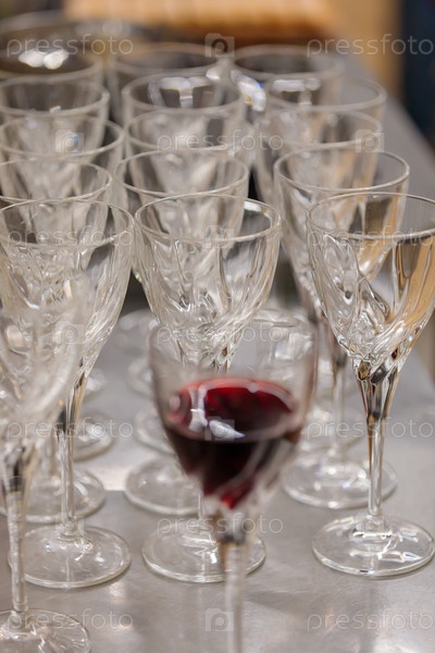 Пустые бокалы на столе. Один бокал красного вина. Праздничное мероприятие