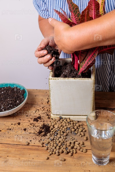 Женщина насыпает землю в новый керамический горшок с пересаженным цветком. Концепция пересадки комнатных растений
