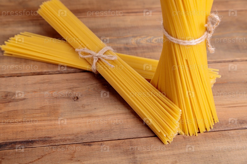 Вертикальный пучок и куча сырых спагетти, перевязанных ниткой. Связка на деревянном фоне