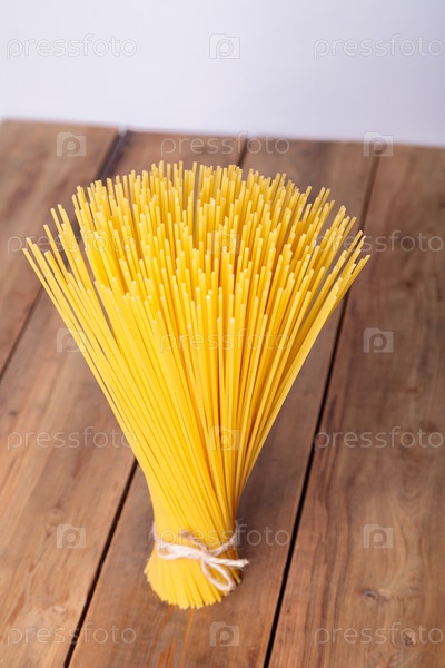 Вертикальный пучок и куча сырых спагетти, перевязанных ниткой. Связка на деревянном фоне. Концепция итальянской кухни