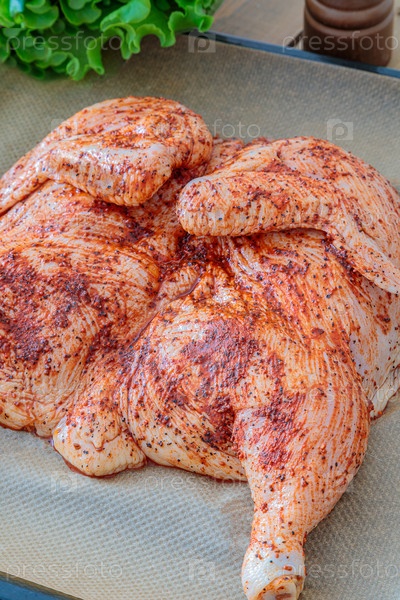 Сырая целая курица на подносе для духовки