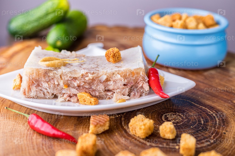 Холодец из говядины и свинины на белом блюдце. Холодная закуска с кусочками сухарей и огурцом