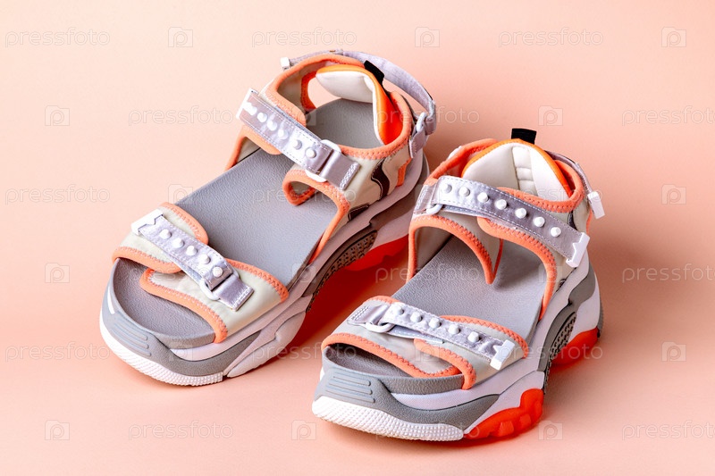 Женские, модные, спортивные сандалии с оранжевыми вставками на розовом фоне. Новые молодежные туфли для девочек. Передний план