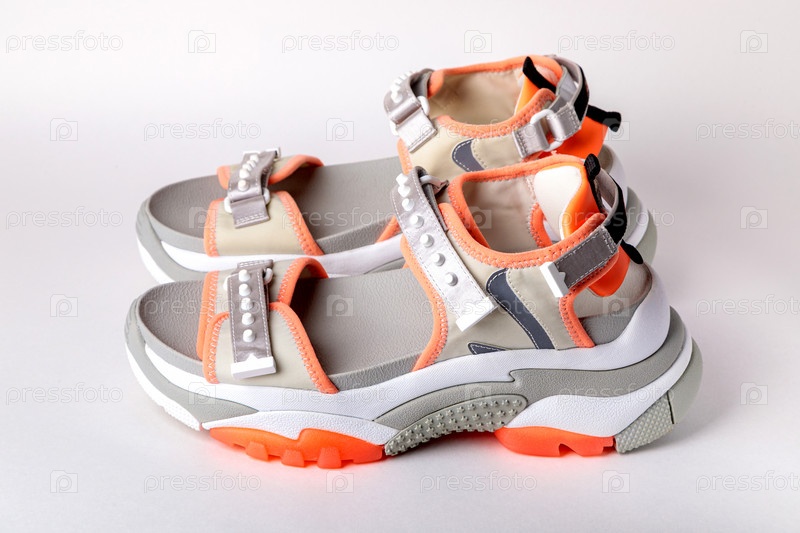 Женские, модные, спортивные сандалии с оранжевыми вставками на белом фоне
