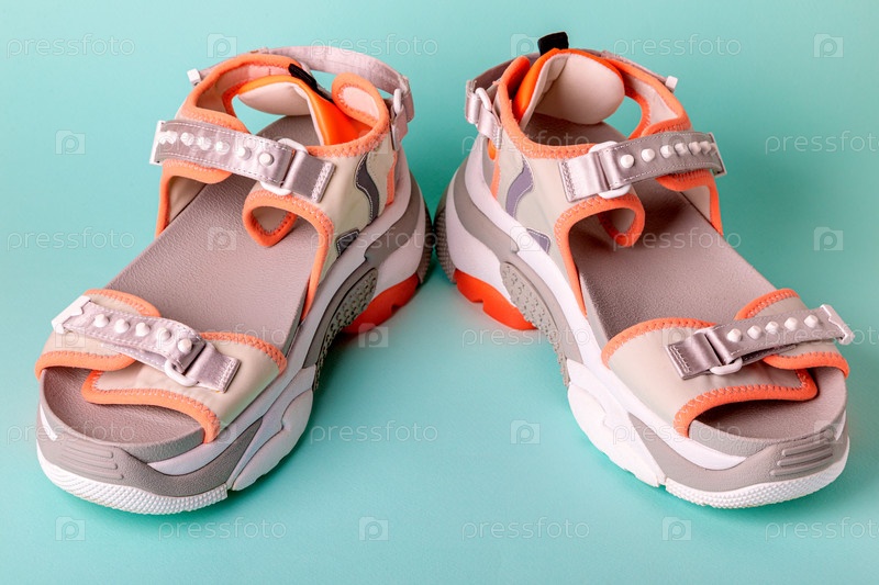 Женские, модные, спортивные сандалии с оранжевыми вставками на голубом фоне