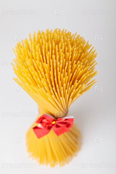 Вертикальная связка, связка сырых спагетти, перевязанная веревкой с красным бантом. Связка на белом фоне. Концепция итальянской кухни на праздник