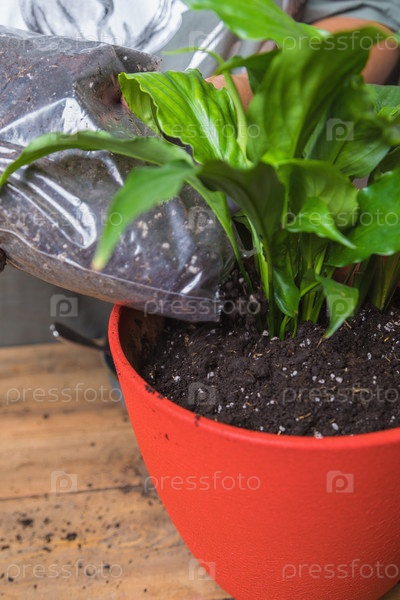 Женщина пересаживает цветок спатифиллума в квадратный цветочный горшок. Цветоводство, крупный план