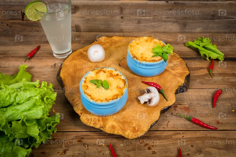 Горшки с жульеном из грибов на деревянной доске