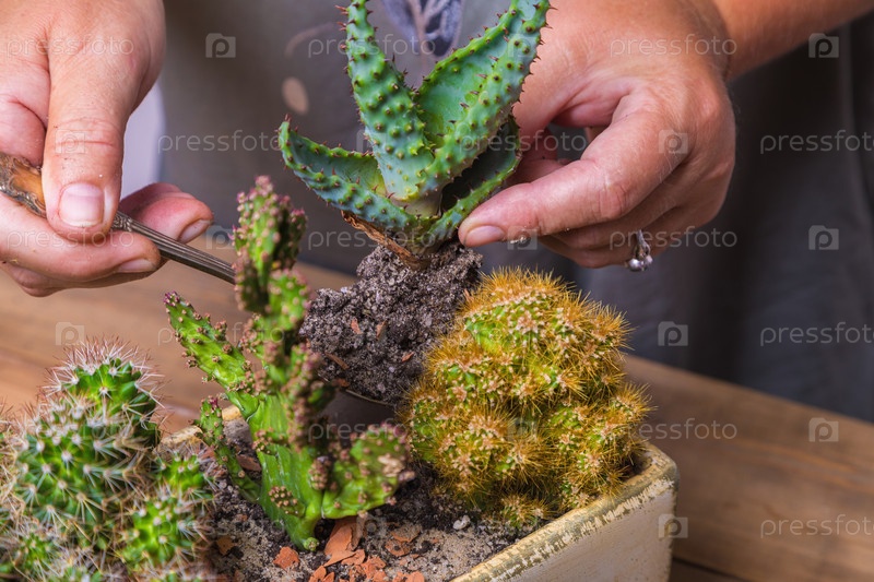 Женщина пересаживает цветок кактуса в небольшой фигурный горшок