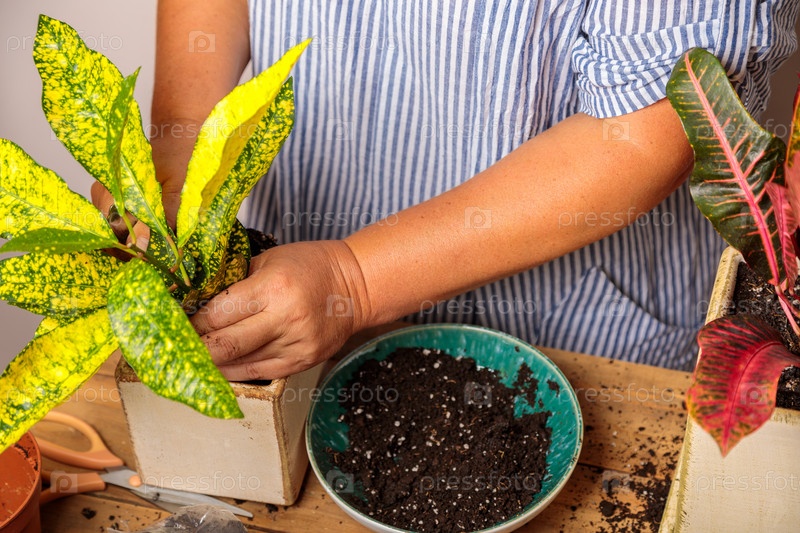 Женщина пересаживает комнатное растение, цветок в керамический горшок