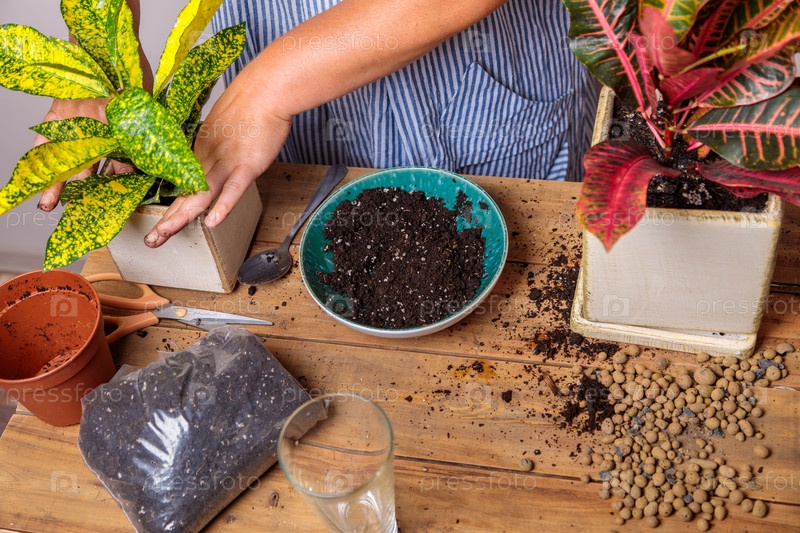 Женщина пересаживает комнатное растение, цветок в керамический горшок