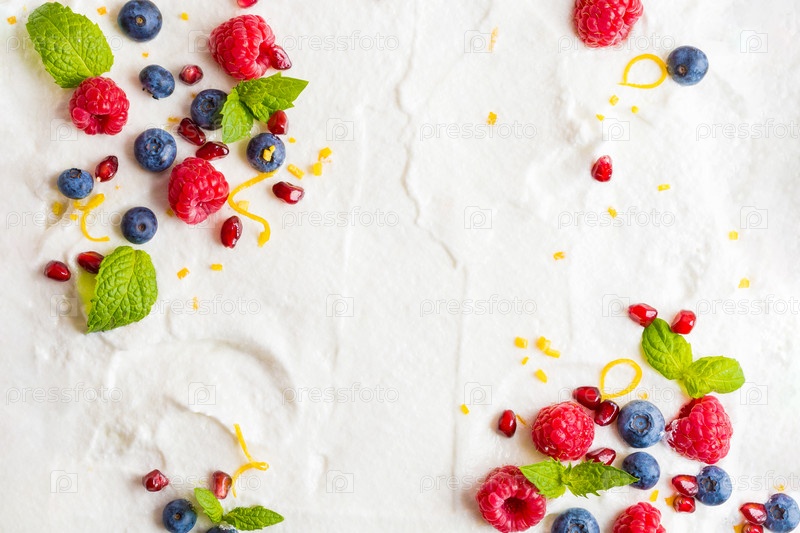 Взбитые сливки из яичных белков с малиной, черникой, гранатом