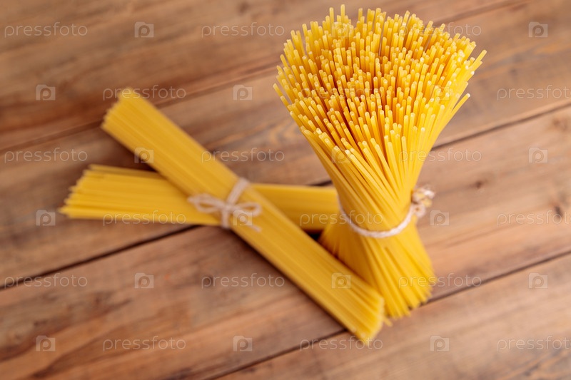 Вертикальный пучок и куча сырых спагетти, перевязанных ниткой. Связка на деревянном фоне