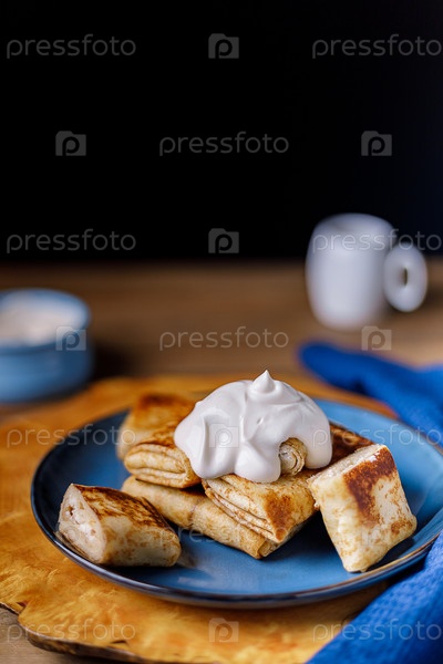 Блинчики с творожной начинкой и сметаной на синей тарелке