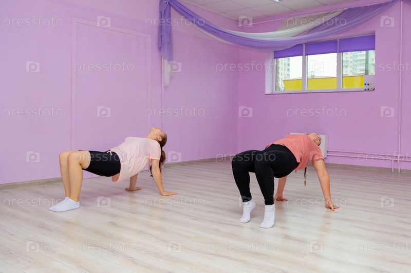 Девушка-инструктор по танцам показывает элементы номера другой девушке. Обучение танцам