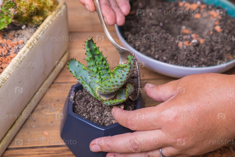 Женщина пересаживает цветок кактуса в небольшой фигурный горшок