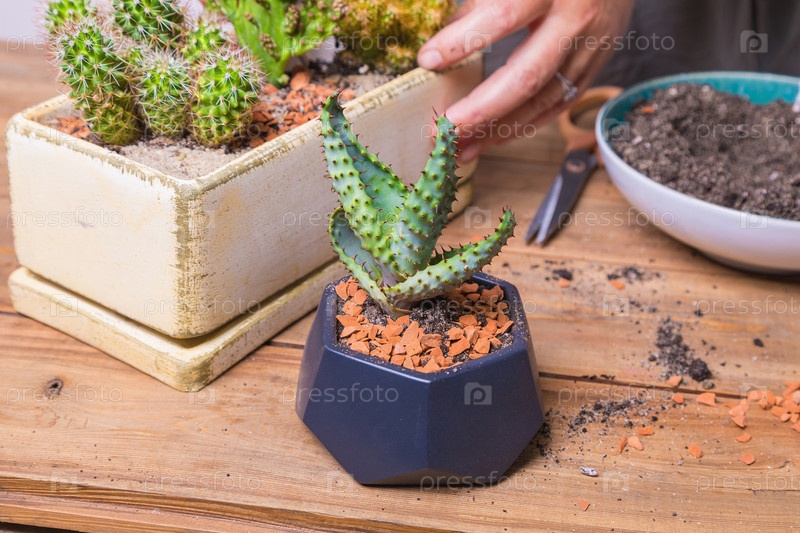 Женщина пересаживает цветок кактуса в небольшой фигурный горшок