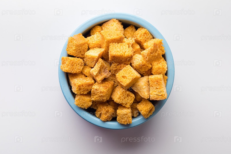 Хлебные крошки квадратной формы в синем горшке на белом фоне. Золотисто-коричневые хлебные крошки, обжаренные в духовке
